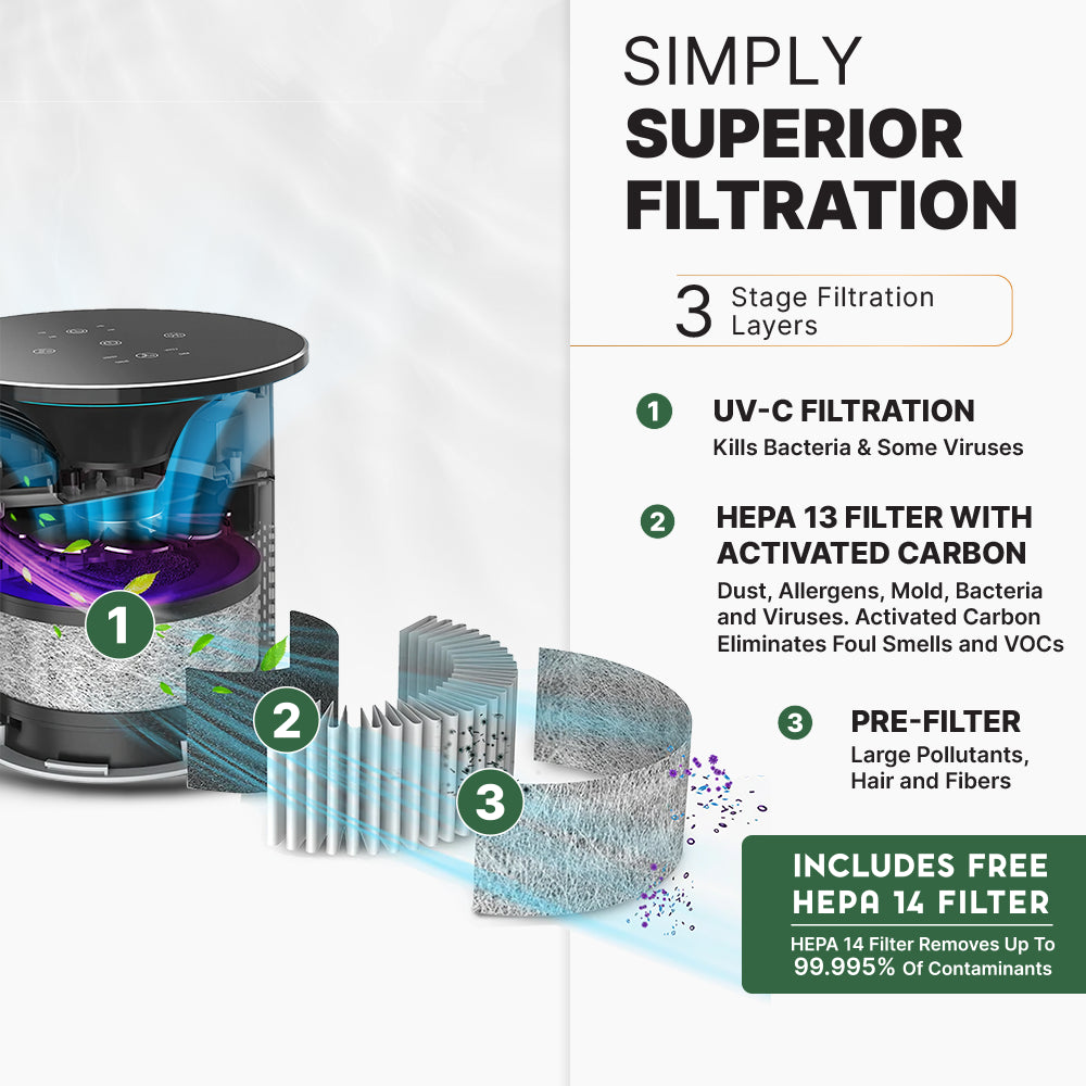 Unlike traditional air purifiers that only use HEPA filtration, the UltraLux Air Sentry 100 combines an odor-removing carbon filter, a general-use True HEPA 13 filter, and a sterilizing UV-C filter. As an added bonus, we’ve included a viral protection True HEPA 14 filter for free! This unique multi-filtration process is the foundation for your home to have the cleanest air. With the Air Sentry 100 you can remove: