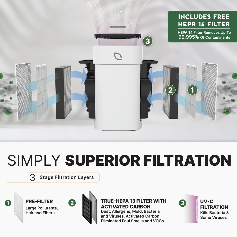 The FDA recommends at least using a HEPA filter to protect against polluted air. The Air Sentry 500 features a true HEPA 13 filter with a 99.97% filtration of particles 0.3 microns or larger. Plus, it includes an alternate True HEPA 14 filter with a 99.997% filtration percentage of particle 0.1 microns or bigger. The HEPA 14 filter is perfect for viral protection during flu season or when sicknesses are going around. Additionally, the carbon filter fights off foul odors and the UV- sanitization technology keeps your space free from health risk particles.