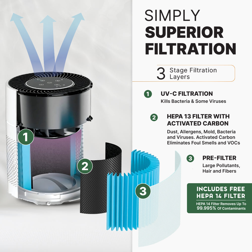 Traditional air purifiers only use HEPA filtration, but the UltraLux Air Sentry 300 goes above and beyond, combining an odor-removing carbon filter, a general-use True HEPA 13 filter, and a sterilizing UV-V filter. Plus, we’ve included a viral protection True HEPA 14 filter for free! This unique triple filtration technology is the foundation for the cleanest air. With the Air Sentry 300, you can remove: